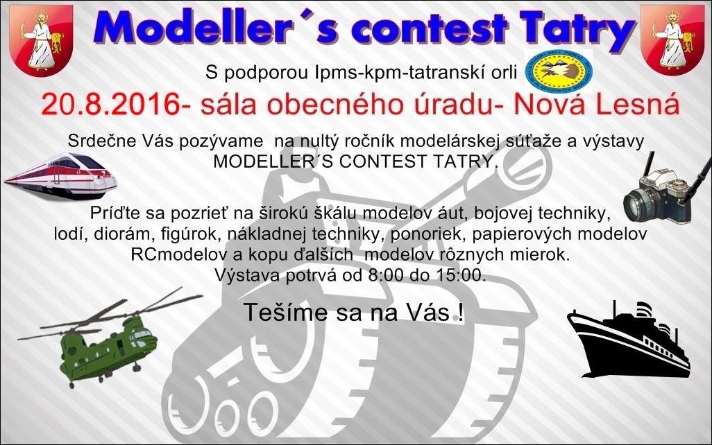 Srdečne Vás pozývame na modelársku výstavu Modeller´s Contest Tatry, ktorá sa uskutoční v obci Nová Lesná dňa 20.8.2016 v sále obecného úradu v čase od 11:00 h do 14:00 h. Organizátori pre vás pripravili sprievodný program a predvádzanie funkčných modelov na lúke a jazierku pri obecnom úrade.