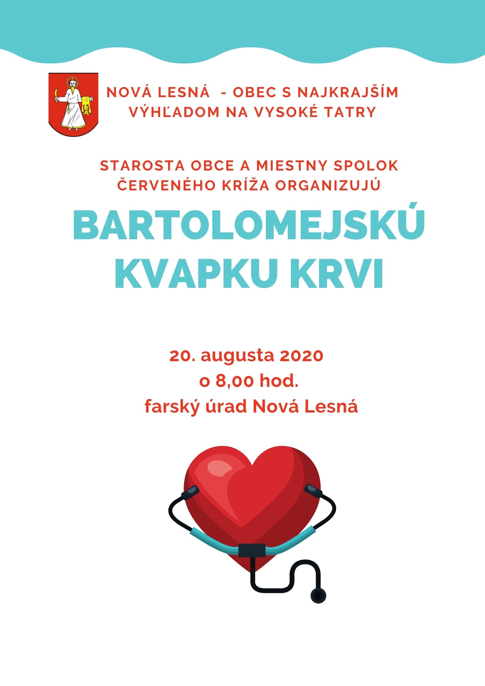 V Novej Lesnej sa vo štvrtok 20.08.2020 stretlo 14 ľudí, z nich 12 mohlo darovať krv na tradičnom odbere pri príležitosti Bartolomejského dňa v priestoroch farského úradu. Všetci darcovia krvi budú odmenení na Dňoch obce Nová Lesná starostom Ing. Petrom Hritzom.