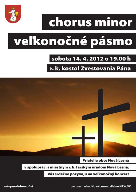 Priatelia obce Nová Lesná v spolupráci s miestnym r. k. farským úradom Nová Lesná, Vás srdečne pozývajú na veľkonočný koncert, ktorý sa uskutoční v sobotu 14.4.2012 o 19.00 h v r. k. kostole Zvestovania Pána v našej obci.